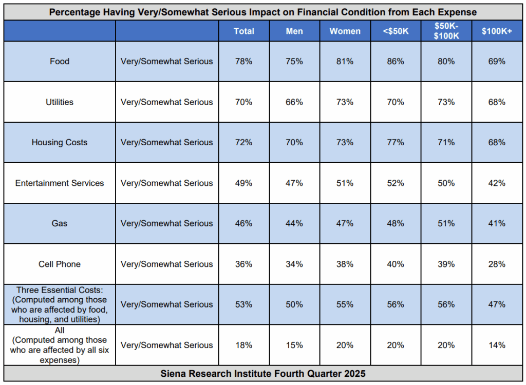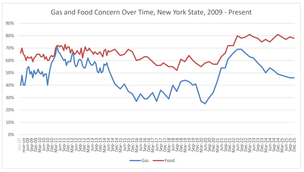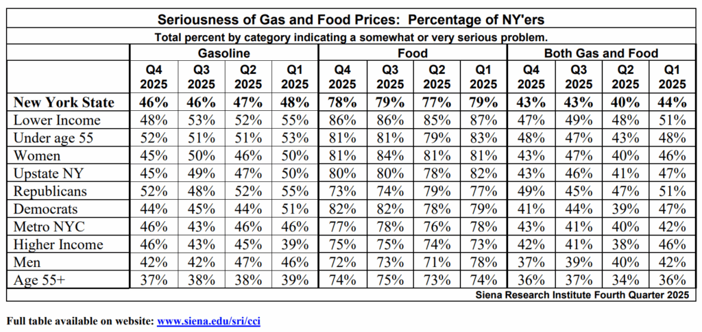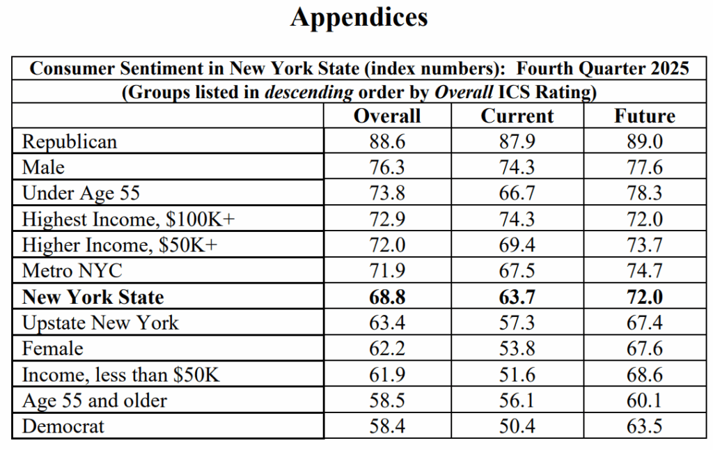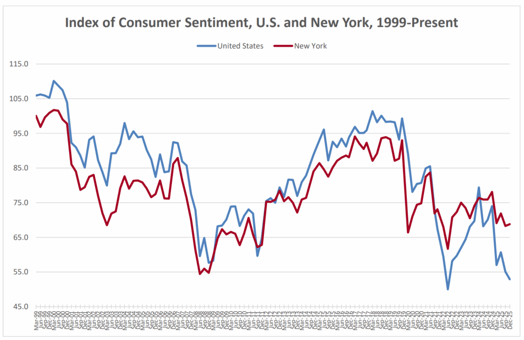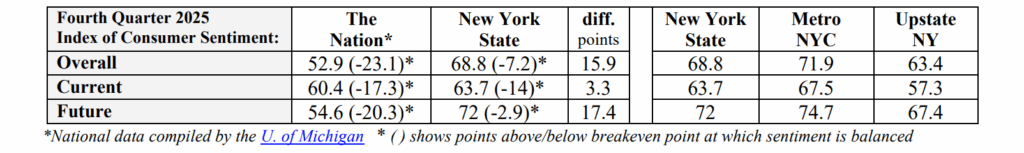 Loudonville, NY – The New York State Index of Consumer Sentiment now stands at 68.8 up 0.5 points from the last measurement in the third quarter of 2025 according to the latest poll by the Siena Research Institute (SRI). New York’s overall Index of Consumer Sentiment is 15.9 points above the national* index of 52.9 following a 2.2-point national decrease. New York’s current index fell 4.1 points to 63.7 and New York’s measure of future expectations increased 3.4 points from 68.6 last quarter to 72.0 today. The Index of Consumer Sentiment remains higher in New York than across the nation. For the fourth consecutive quarter, the overall index is below the breakeven point of balanced optimism and pessimism.