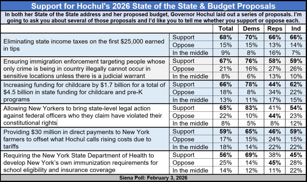 Six Hochul proposals each has between 58-68% support, including four that have bipartisan support: eliminating state income tax on the first $25,000 earned in tips (68-15%), ensuring immigration enforcement targeting people whose only crime is being in the country illegally cannot occur in sensitive locations (schools, hospitals, places of worship) unless there is a judicial warrant (67-21%), increasing childcare funding by $1.7 billion (66-18%), and providing $30 million in payments to farmers to offset what Hochul calls rising costs due to tariffs (59-17%).