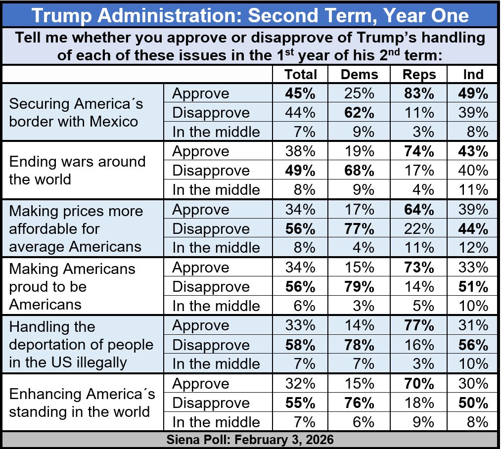 • Trump Job Approval Break Even on Securing Border with Mexico; Underwater on His Handling of Deportations, Making Prices More Affordable, Making Americans Proud to Be Americans